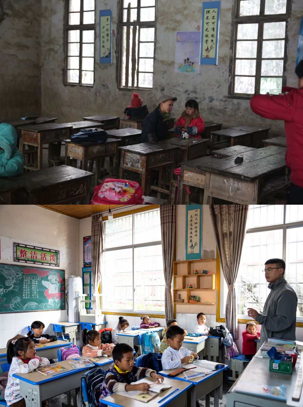 拼版照片:上圖為過(guò)去十八洞村小學(xué)內景(資料照片);下圖為2023年10月20日拍攝的翻修后的十八洞村小學(xué)內景(新華社記者陳思汗攝)。新華社發(fā)