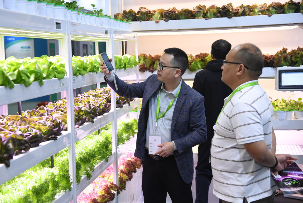 2023世界農業(yè)科技創(chuàng )新大會(huì )11月2日至4日在北京舉行。這是2023年11月2日,工作人員(左)在世界農業(yè)科技博覽會(huì )現場(chǎng)介紹智慧植物工廠(chǎng)。新華社記者 任超 攝