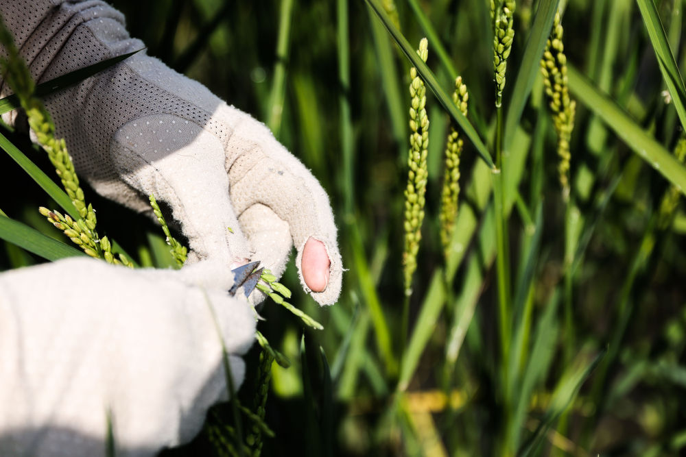 2023年2月22日,青島海水稻研究發(fā)展中心的科研人員于萌在三亞的國家南繁科研育種基地里做水稻雜交實(shí)驗。新華社記者 張麗蕓 攝