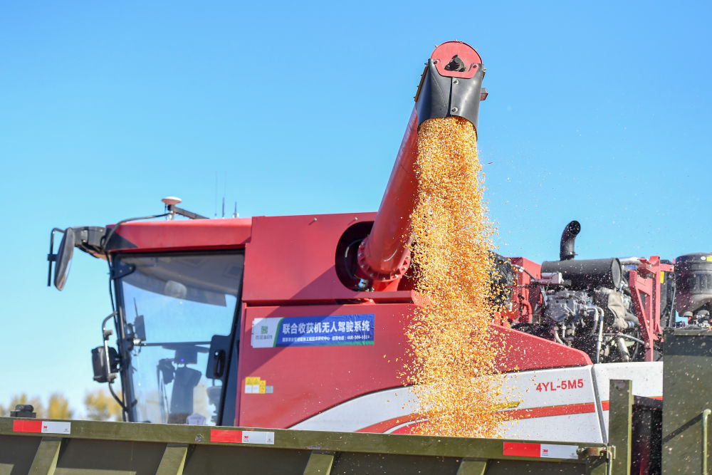 在中國科學(xué)院“黑土糧倉”科技會(huì )戰長(cháng)春示范區公主嶺示范基地,無(wú)人駕駛農機將收獲的玉米裝車(chē)(2023年10月19日攝)。新華社記者 張楠 攝