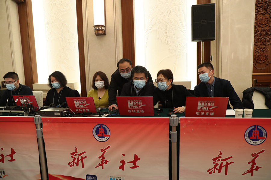 新華網(wǎng)記者在現場(chǎng)做直播準備工作