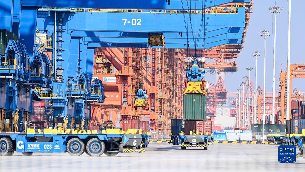 在廣西欽州港自動(dòng)化集裝箱碼頭,無(wú)人駕駛車(chē)輛在轉運集裝箱(2023年2月25日攝)。新華社記者 張愛(ài)林 攝