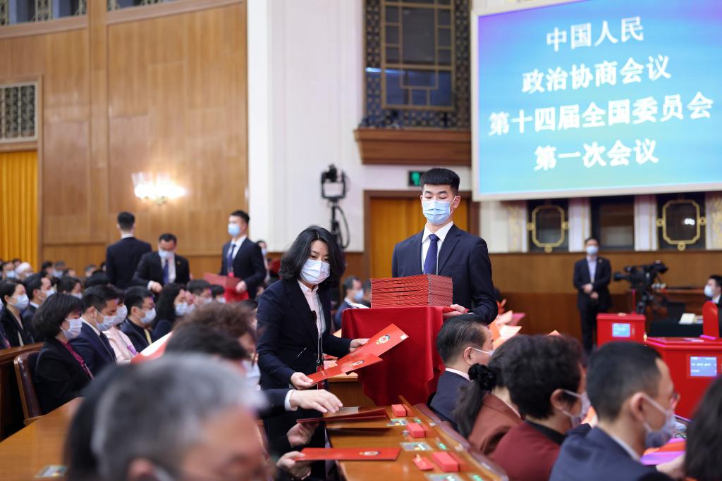 3月10日,全國政協(xié)十四屆一次會(huì )議在北京人民大會(huì )堂舉行第三次全體會(huì )議。這是工作人員發(fā)放選票。