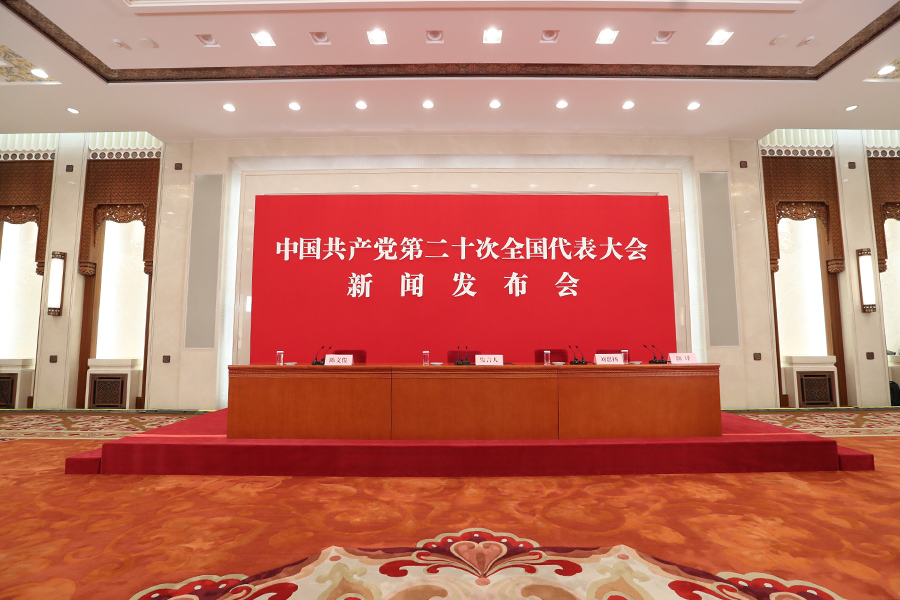 中國共產(chǎn)黨第二十次全國代表大會(huì )新聞發(fā)言人于2022年10月15日(星期六)16時(shí)30分在人民大會(huì )堂舉行新聞發(fā)布會(huì )。圖為發(fā)布會(huì )開(kāi)始前。(新華網(wǎng) 王翰林 攝)