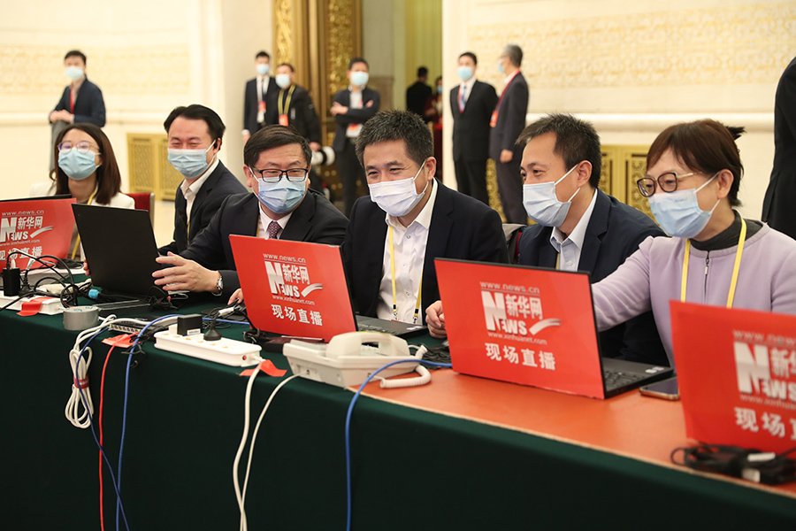 中國共產(chǎn)黨第二十屆中央委員會(huì )第一次全體會(huì )議新選出的中央政治局常委將于23日中午12時(shí)許,同采訪(fǎng)中共二十大的中外記者見(jiàn)面。圖為新華網(wǎng)記者在現場(chǎng)進(jìn)行直播準備。(新華網(wǎng) 黃博陽(yáng) 攝)