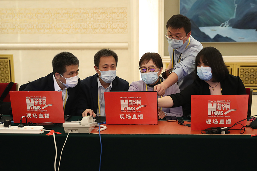 中國共產(chǎn)黨第二十屆中央委員會(huì )第一次全體會(huì )議新選出的中央政治局常委將于23日中午12時(shí)許,同采訪(fǎng)中共二十大的中外記者見(jiàn)面。圖為新華網(wǎng)記者在現場(chǎng)進(jìn)行直播準備。(新華網(wǎng) 黃博陽(yáng) 攝)