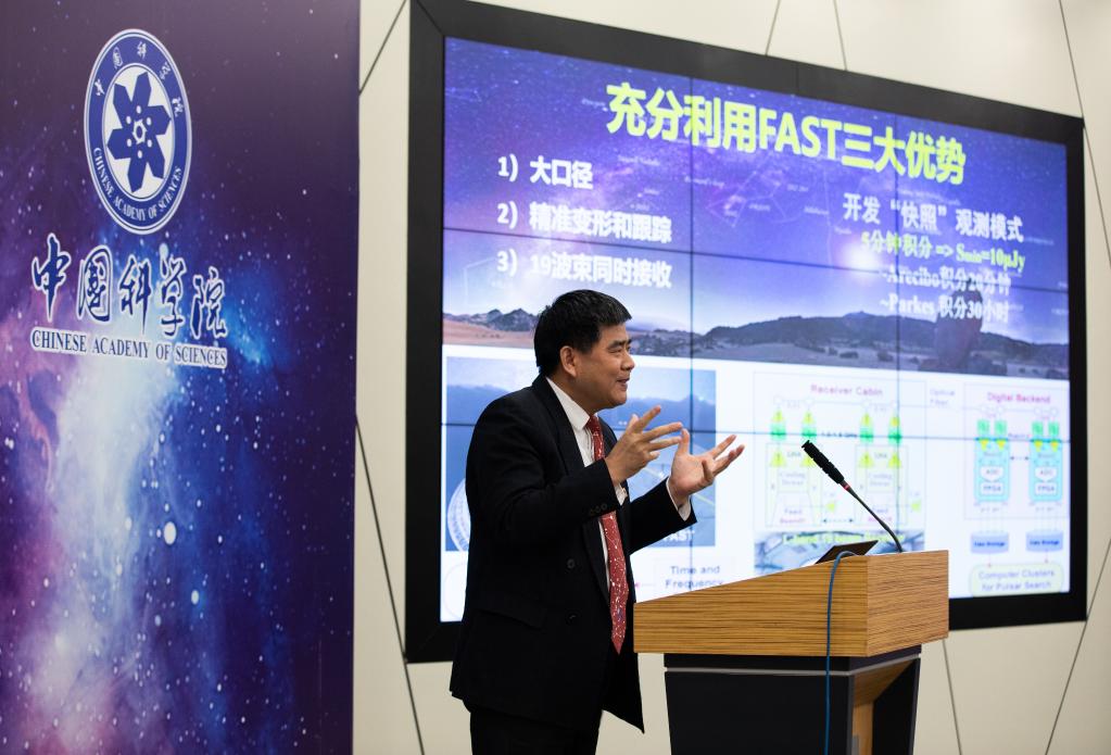 1月5日,在中科院國家天文臺舉行的新聞發(fā)布會(huì )上,國家天文臺韓金林在介紹FAST在脈沖星搜尋方面的重要進(jìn)展。新華社記者 金立旺 攝