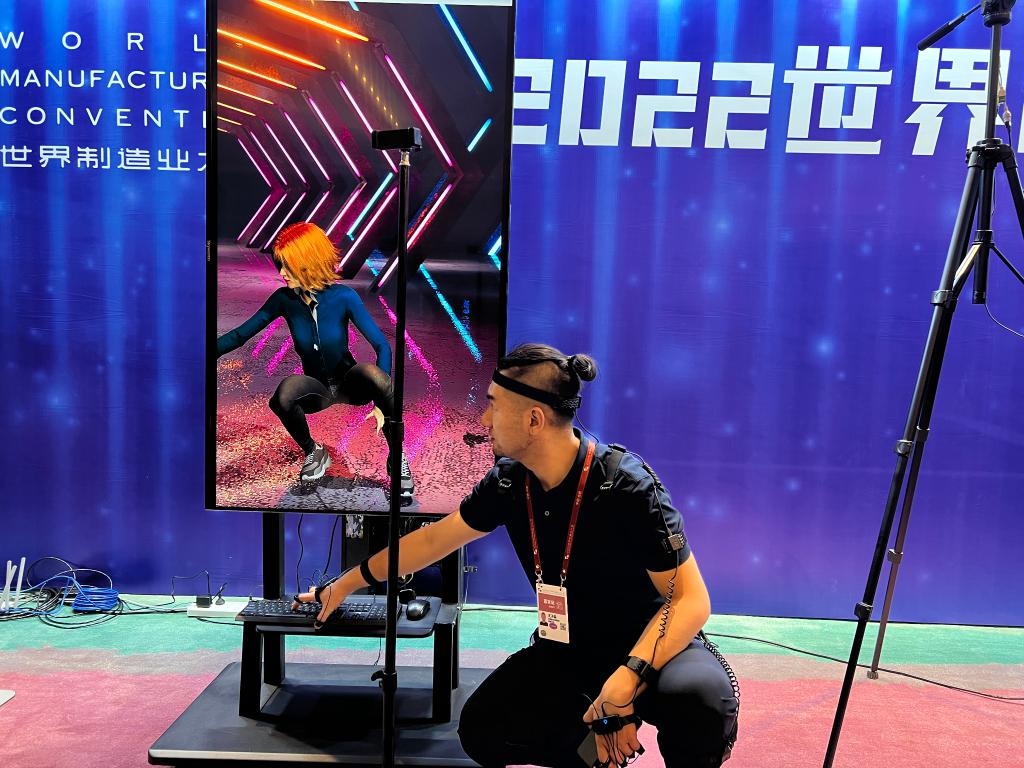 穿著(zhù)輕便的裝備,自如地下蹲、轉身、舞動(dòng)雙手……一臺大屏幕前,合肥孿生宇宙科技有限公司創(chuàng )始人王子淼正在和屏幕里的虛擬人精準“同步”。這家成立不到一年的初創(chuàng )企業(yè)將自主研發(fā)的孿宇一鍵虛擬人直播設備帶到了2022世界制造業(yè)大會(huì )現場(chǎng)。