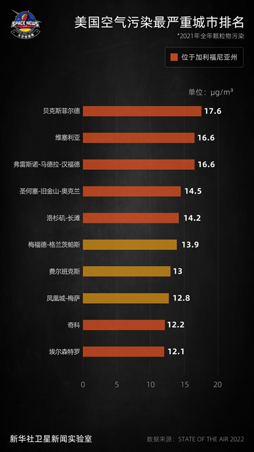 作為受山火影響最嚴重的州之一,加州空氣污染位列第一。2021年,美國顆粒物污染最嚴重的5個(gè)城市均在加州。