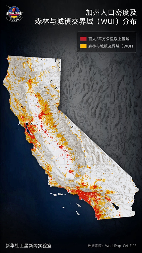 利用“新華地球”全球信息感知、分析與決策支持系統,新華社衛星新聞實(shí)驗室分析了加州人口密度與WUI分布的關(guān)系:人口高密集區域與WUI區域顯著(zhù)重疊,林地外圍少有過(guò)渡地帶。