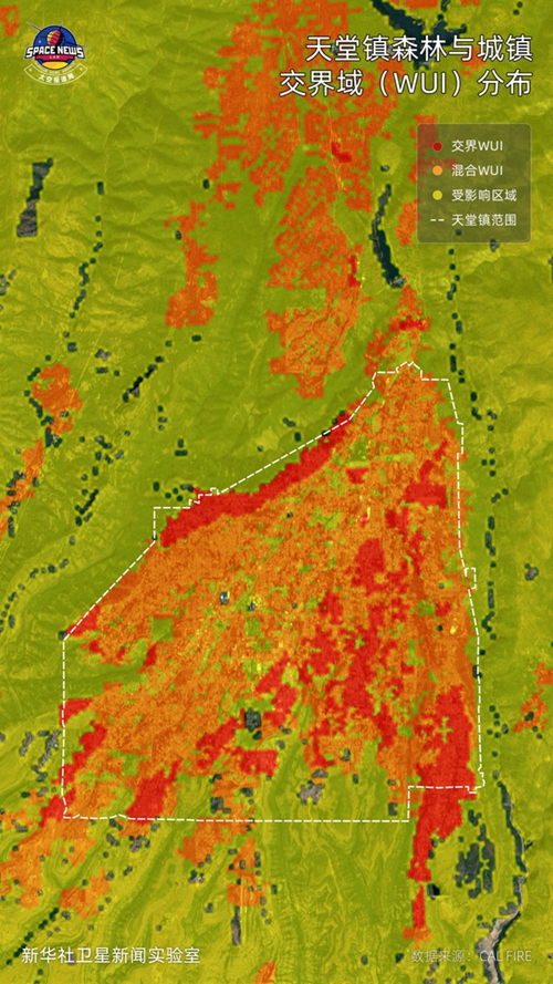 新華社衛星新聞實(shí)驗室分析顯示,天堂鎮幾乎完全處于WUI區域,其中大部分為建筑物與植被穿插的混合WUI,還有建筑物與茂密植被相鄰的交界WUI。