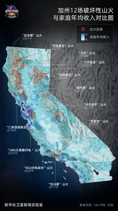 利用“新華地球”系統制作的數據圖,進(jìn)一步表明了山火與家庭收入之間的關(guān)系:大部分過(guò)火區域居民為中等收入家庭?;馂臎](méi)有蔓延到低收入家庭為主的區域,主要原因是低收入者大多居住在城市以及平原上的老城鎮,根本無(wú)力在山林邊建造獨立住宅。