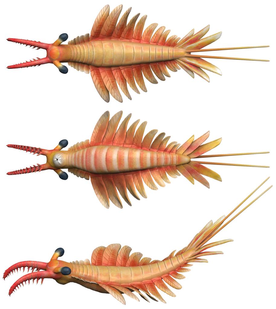 研究團隊對這塊奇蝦化石重新進(jìn)行了精細的形態(tài)解剖研究。參與研究的中科院南古所副研究員曾晗介紹,跟其他奇蝦相似,這只“明星奇蝦”有著(zhù)流線(xiàn)型的軀干,軀干上長(cháng)著(zhù)成對的槳狀葉片和鰓片,用于游泳和呼吸。它的頭部有一對多刺的鉗子和一對大大的復眼。頭部下方長(cháng)著(zhù)一只輻射狀口器。十分特別的是,這只奇蝦的尾部長(cháng)著(zhù)一對尤為細長(cháng)的尾叉,前爪的形態(tài)細節也與其他奇蝦明顯不同。