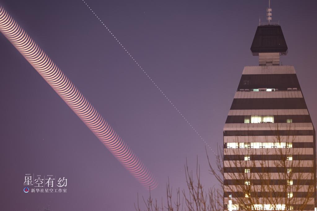 這是北京市天文攝影愛(ài)好者王俊峰2023年2月22日在北京市西城區拍攝的金星伴月牙(多張軌跡疊加)。(本人供圖)