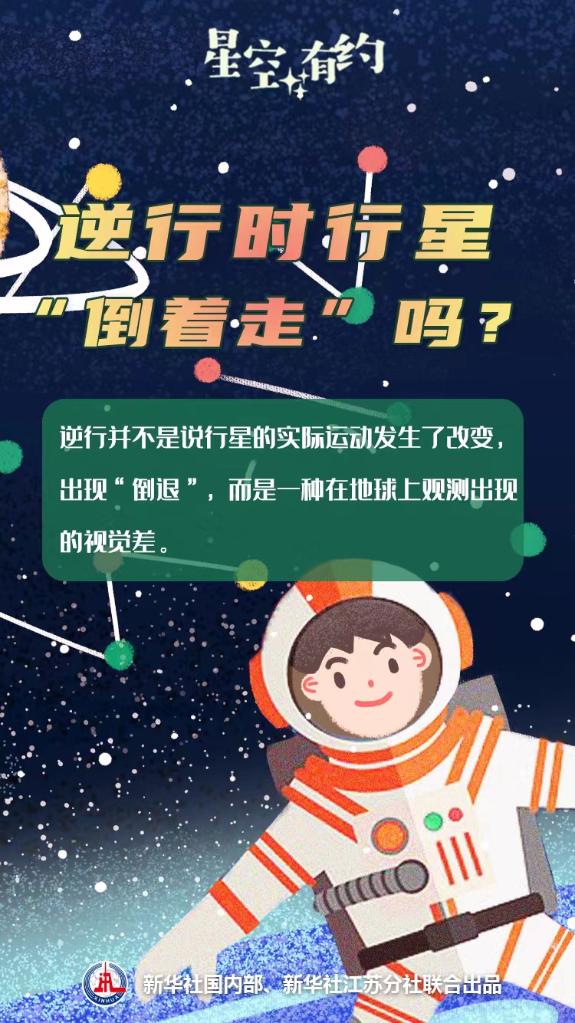 “逆行并不是說(shuō)行星的實(shí)際運動(dòng)發(fā)生了改變,出現‘倒退’,而是一種在地球上觀(guān)測出現的視覺(jué)差?!蓖蹩瞥f(shuō),行星視運動(dòng)分為三種:順行、逆行、留。順行時(shí),行星在天球上的運動(dòng)方向為自西向東,與太陽(yáng)在天球上的周年視運動(dòng)方向一致。逆行時(shí),行星在天球上的運動(dòng)方向為自東向西,與太陽(yáng)在天球上的周年視運動(dòng)方向相反。順行逆行互相轉換時(shí),行星在天球上的位置短時(shí)期不動(dòng),稱(chēng)為留。