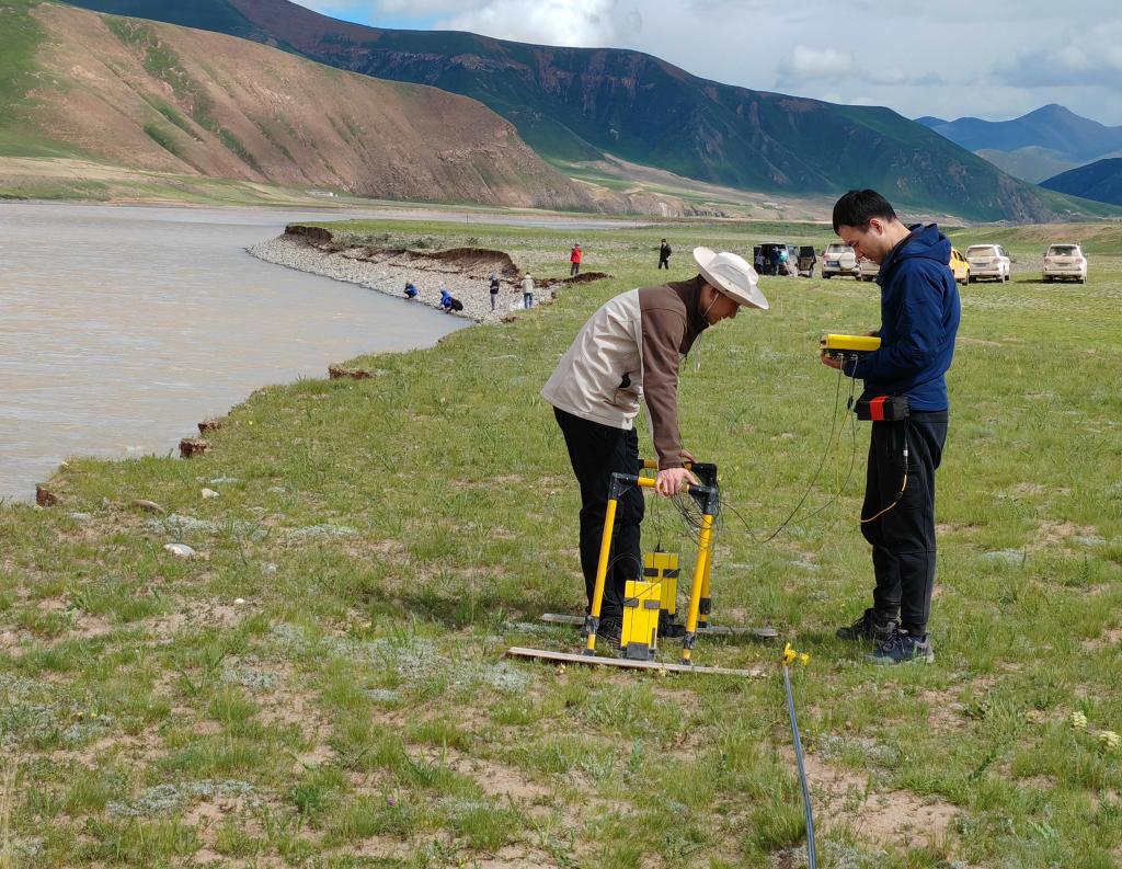 7月25日,范越(前左)和董士琦在長(cháng)江上游干流通天河畔開(kāi)展地質(zhì)雷達探測。(受訪(fǎng)者供圖)