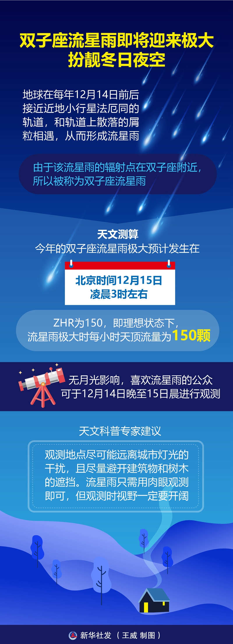 12月中旬,天黑后不久雙子座就從東方偏北的地平線(xiàn)上升起?!敖衲甑碾p子座流星雨不會(huì )受到月光影響,觀(guān)測條件極佳,喜歡流星雨的發(fā)燒友14日晚即可守著(zhù)夜空,有較大的機會(huì )看到流星;有毅力的可以堅持到15日凌晨,屆時(shí)看到的流星數量會(huì )更多?!毙蘖Ⅸi說(shuō)。