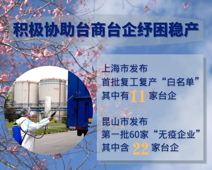 “二是及時(shí)了解回應臺商訴求,幫助解決臺企實(shí)際困難?!彼f(shuō),上海、蘇州、昆山等地臺辦和臺協(xié)及時(shí)完善工作機制,成立助力臺企臺胞紓困解難工作專(zhuān)班,組織召開(kāi)專(zhuān)題工作會(huì )和線(xiàn)上交流會(huì ),了解臺企訴求,研商工作方案,提供精準服務(wù)。上海市臺辦積極協(xié)調當地有關(guān)部門(mén),出具企業(yè)證明、通行證等,解決臺企燃眉之急;積極協(xié)助臺企對接金融機構,為臺企解決融資需求設立服務(wù)專(zhuān)窗,推動(dòng)加快審批進(jìn)度。昆山市臺辦協(xié)調幫助臺企解決貨運等問(wèn)題。