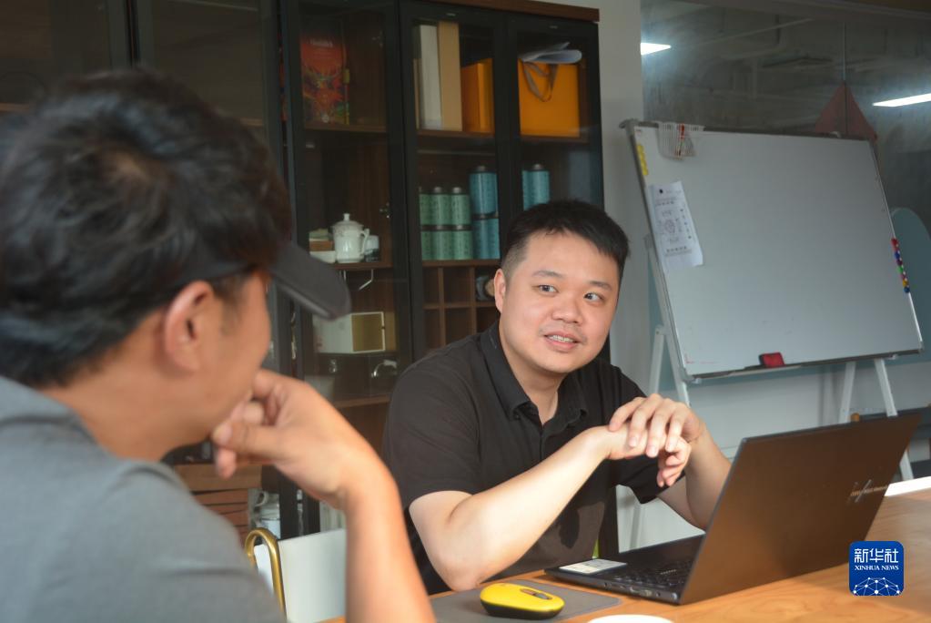 6月12日,臺青張培軒與合作伙伴交流。新華社記者 顏之宏 攝