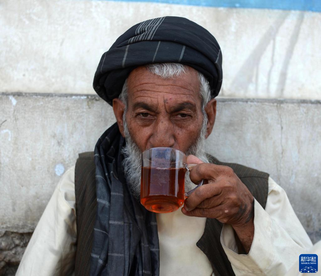 9月14日,一名男子在阿富汗坎大哈街頭喝茶。