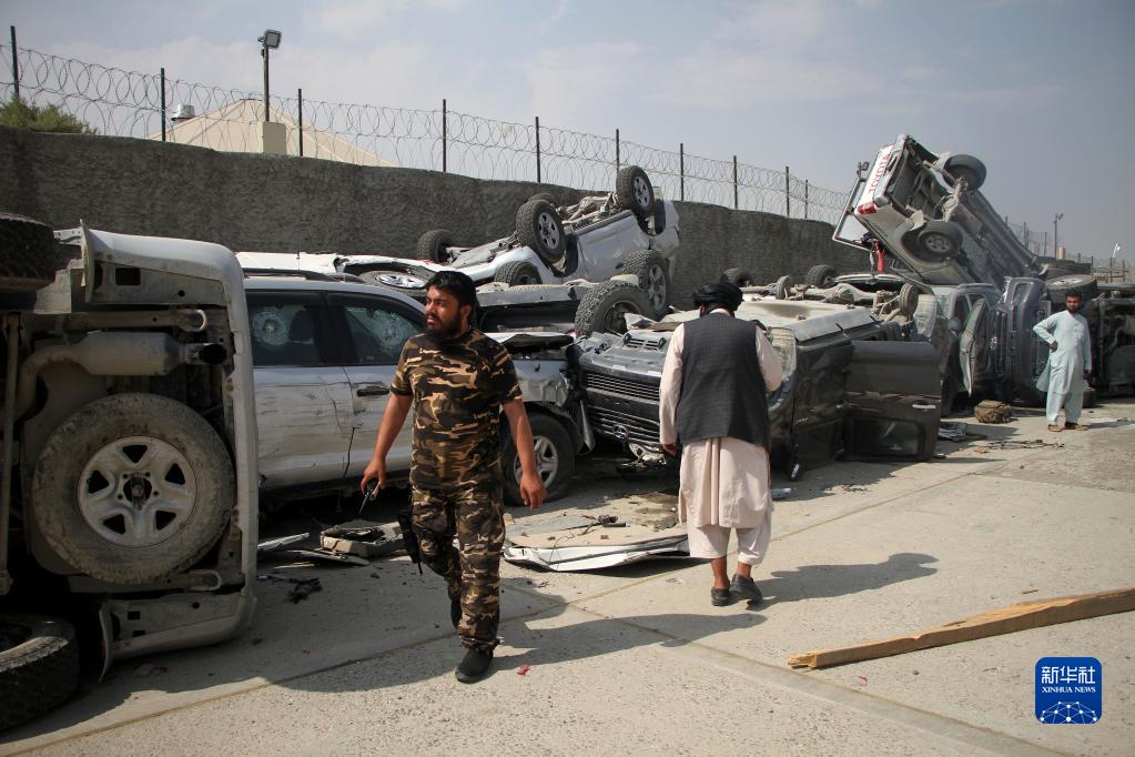 9月20日,在阿富汗喀布爾機場(chǎng),塔利班人員走過(guò)損毀的汽車(chē)。