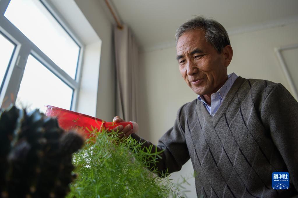10月11日,在額濟納旗七道橋管護站,護林員魏存廣給自己養的綠植澆水。新華社記者 李志鵬 攝
