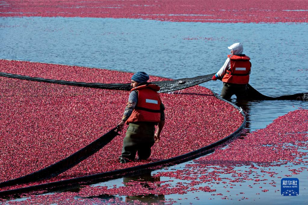 10月19日,農民在加拿大里士滿(mǎn)收獲蔓越莓。