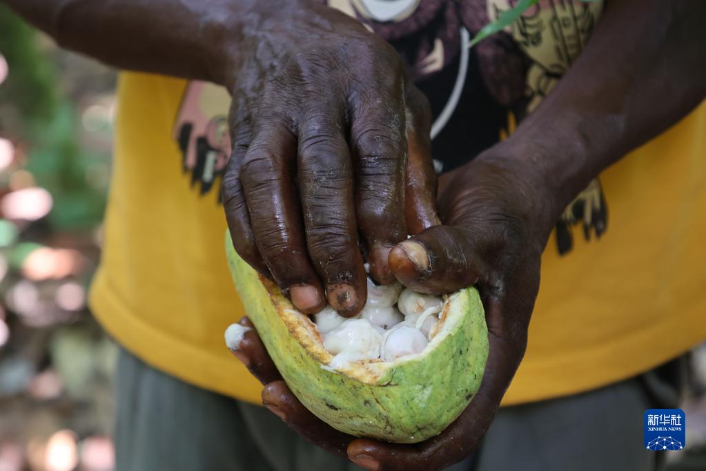 11月15日,在加納東部省的一處可可種植園,一名種植戶(hù)查看新鮮的可可豆。