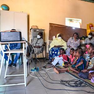 11月22日,在塞內加爾達喀爾近郊的辛迪亞小學(xué),同學(xué)們課間坐在教室的地毯上觀(guān)看投影播放的動(dòng)畫(huà)片。