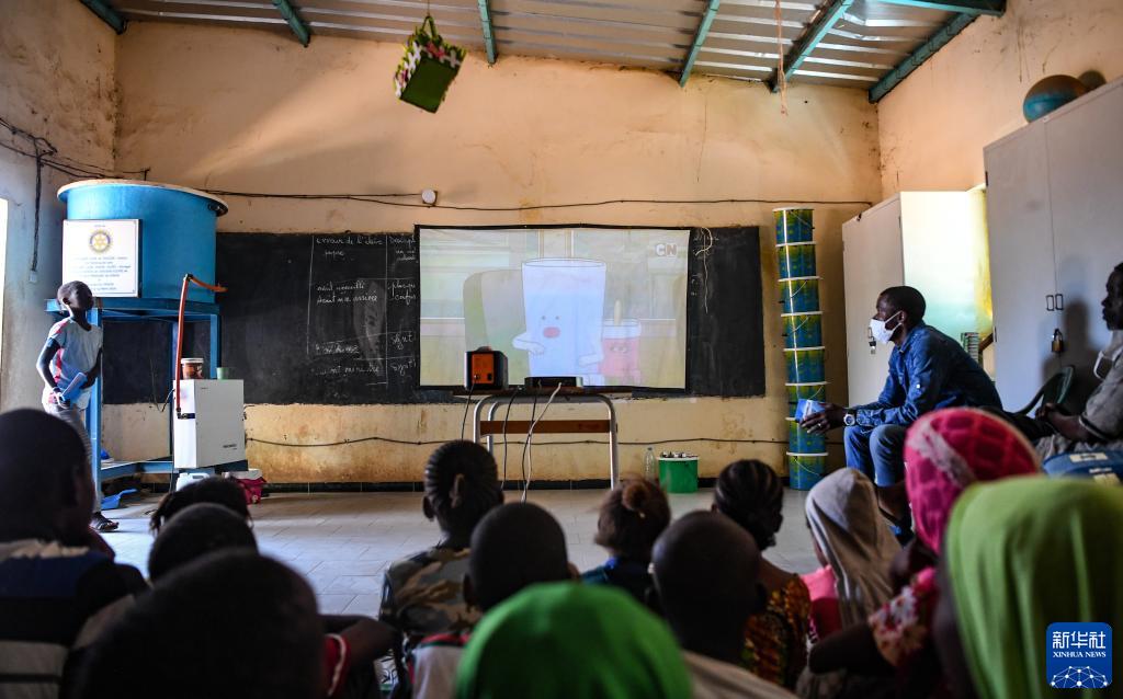 11月22日,在塞內加爾達喀爾近郊的辛迪亞小學(xué),同學(xué)們課間坐在教室的地毯上觀(guān)看投影播放的動(dòng)畫(huà)片。
