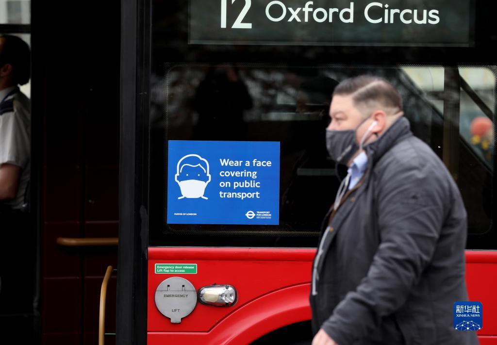 11月24日,英國倫敦的公共汽車(chē)上貼著(zhù)提醒人們佩戴口罩的防疫告示。