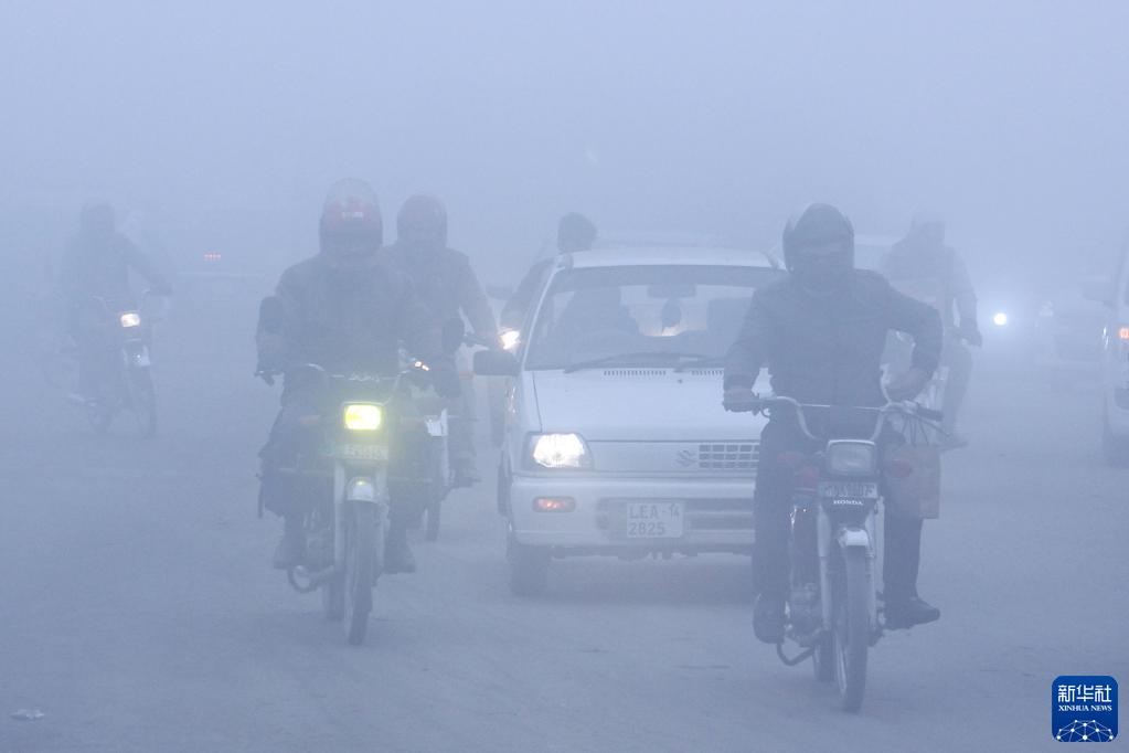 12月15日,機動(dòng)車(chē)在大霧彌漫的巴基斯坦拉合爾街頭行駛。