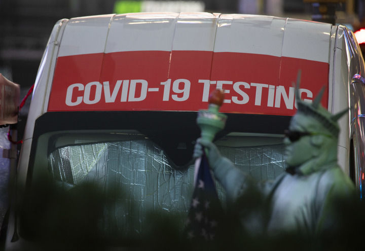 12月20日,一名街頭演員在美國紐約時(shí)報廣場(chǎng)一處臨時(shí)核酸檢測點(diǎn)旁表演。新華社記者王迎攝
