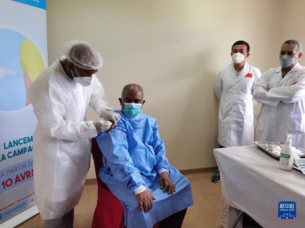 2021年4月10日,科摩羅總統阿扎利(左二)在首都莫羅尼北部的埃爾·馬魯夫醫院接種由中國國藥集團生產(chǎn)的新冠疫苗。