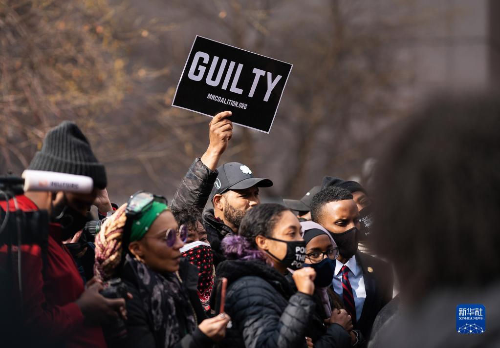 2021年4月20日,民眾手舉“有罪”的標語(yǔ)聚集在美國明尼阿波利斯市的法庭附近。當日,美國前白人警察德雷克·肖萬(wàn)被控殺害非洲裔男子喬治·弗洛伊德案在明尼蘇達州明尼阿波利斯市宣判,肖萬(wàn)被控的謀殺和過(guò)失殺人等三項罪名全部成立。