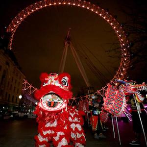 1月28日,在英國倫敦,演員在亮起“中國紅”的“倫敦眼”前表演舞龍。