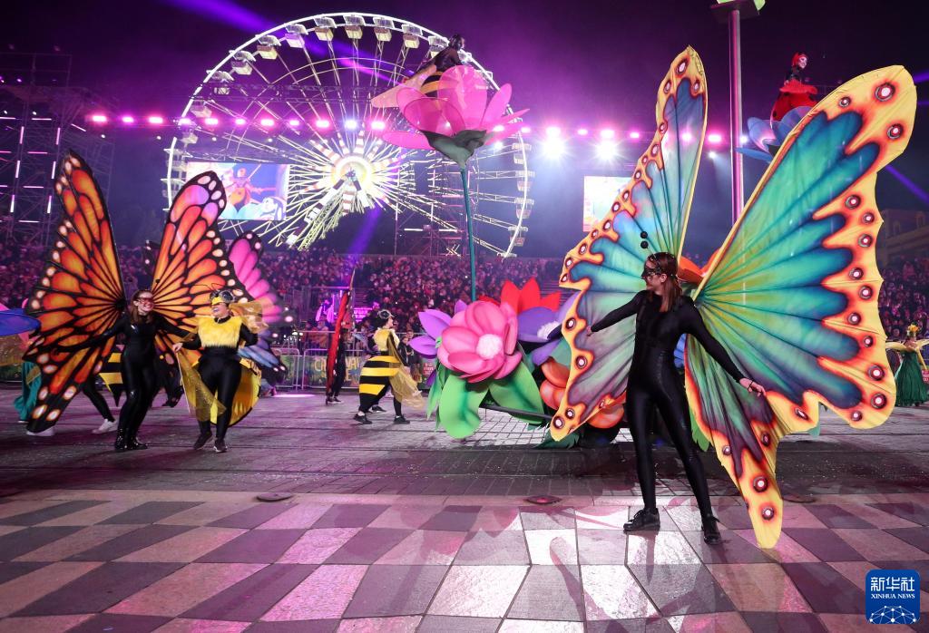這是2月12日在法國南部城市尼斯拍攝的狂歡節花車(chē)夜間游行現場(chǎng)。