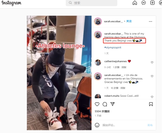 她對自己的訓練非常滿(mǎn)意,特意在海外社交媒體用英語(yǔ)和西班牙語(yǔ)雙語(yǔ)發(fā)文稱(chēng):“這是我在冬奧村里日常訓練的一天。謝謝你,北京!”