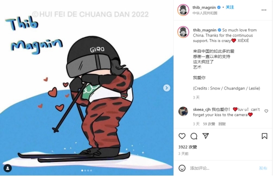 西班牙滑雪運動(dòng)員蒂博·馬格寧用雙語(yǔ)感謝中國。(圖片來(lái)源:Instagram)
