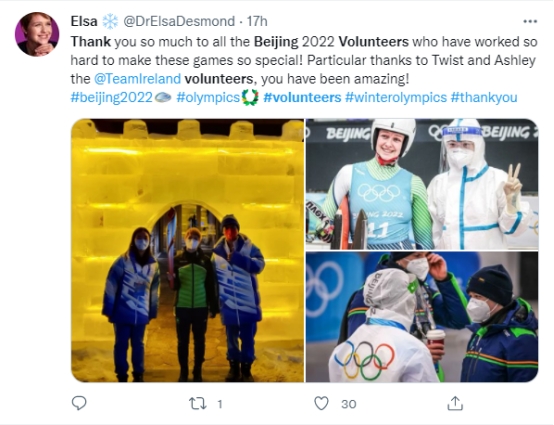格魯吉亞高山滑雪運動(dòng)員妮諾·齊克勞里說(shuō)“中國志愿者非常熱情,把自己的快樂(lè )傳遞給所有運動(dòng)員”;日本《Daily》記者稱(chēng)志愿者“全都是親切的工作人員,厚重防護服下是一雙雙含笑的眼睛”。愛(ài)爾蘭雪橇運動(dòng)員埃爾莎·德斯蒙德在自己的社交媒體賬號發(fā)文感謝志愿者們的熱情幫助。