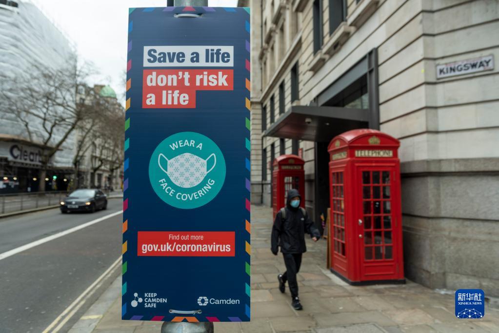 2月21日,在英國倫敦,一名男子經(jīng)過(guò)街頭鼓勵人們戴口罩的告示。