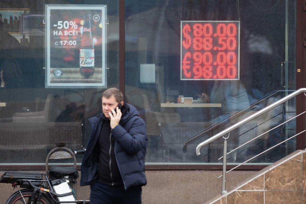 數據顯示,美元對盧布匯率2月28日一度暴漲超過(guò)40%,至創(chuàng )紀錄的1比119。本月以來(lái),美元對盧布匯率已上漲約50%。