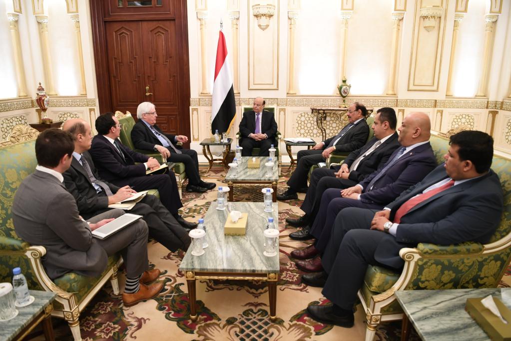 2019年2月12日,在沙特阿拉伯首都利雅得,也門(mén)總統哈迪(中)會(huì )見(jiàn)來(lái)訪(fǎng)的時(shí)任聯(lián)合國也門(mén)問(wèn)題特使馬丁·格里菲思(左四)。新華社發(fā)