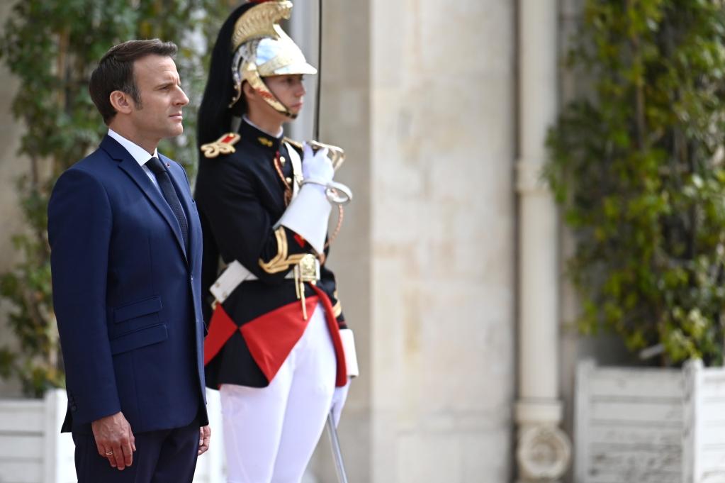 5月7日,在法國巴黎愛(ài)麗舍宮,法國總統馬克龍檢閱儀仗隊。(新華社發(fā))