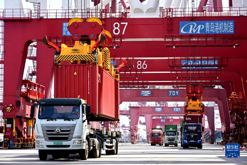 山東港口青島港前灣港區,集裝箱被吊上貨輪(6月15日攝)。青島海關(guān)數據顯示,今年1月至5月,青島直達金磚國家的航線(xiàn)共完成箱量83萬(wàn)標箱,同比增長(cháng)12%,其中出口量增長(cháng)26.1%。新華社記者 李紫恒 攝