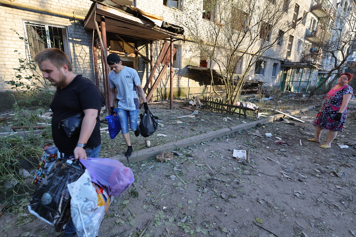 6月20日,頓涅茨克當地居民從被損壞的建筑撤離。新華社發(fā)(維克托攝)