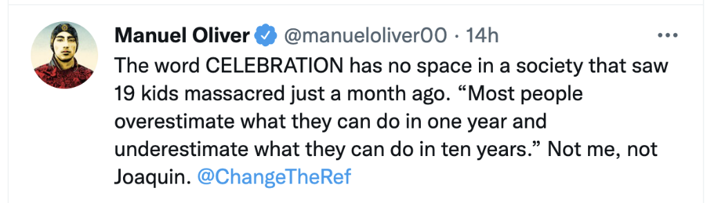 奧利弗的社交媒體賬號至今仍以?xún)鹤拥男は褡鳛轭^像。就在應邀出席白宮這場(chǎng)“慶功會(huì )”前,他在社交媒體上發(fā)文說(shuō):“美國一個(gè)多月前才發(fā)生了一場(chǎng)造成19個(gè)孩子遇害的槍擊慘案,現在可不應該使用‘慶?!@個(gè)詞?!?/strong>
