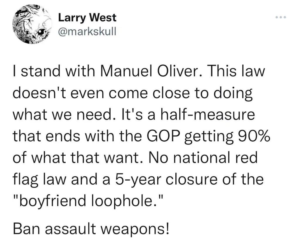 “沒(méi)什么可慶祝的?!?/strong>奧利弗在離開(kāi)白宮后接受美國媒體采訪(fǎng)時(shí)再次重申自己的觀(guān)點(diǎn),直言這份法案遠不足以應對美國槍支暴力痼疾。“這是一個(gè)巨大的謊言,我們相互欺騙,認為有了應對槍支暴力的辦法,但實(shí)際上并沒(méi)有?!?/strong>