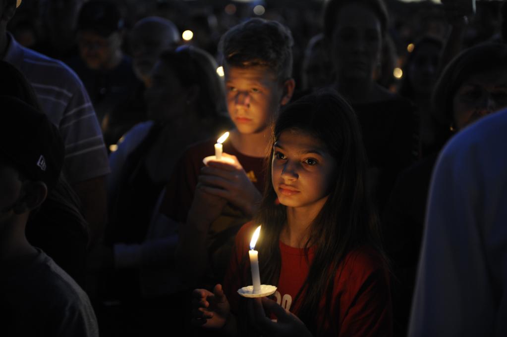 2018年2月15日,在美國佛羅里達州帕克蘭市,人們手舉蠟燭參加為悼念校園槍擊案遇難者舉行的守夜活動(dòng)。新華社記者劉陽(yáng)攝