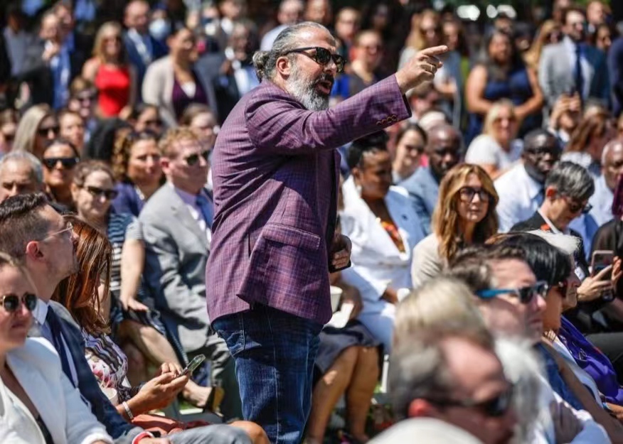 11日“慶功會(huì )”現場(chǎng),拜登正在講話(huà)時(shí),觀(guān)眾席上突然站起一名中年男子,高聲喊話(huà)?!白?,聽(tīng)我把話(huà)說(shuō)完?!卑莸钦f(shuō)。不過(guò),抗議者沒(méi)有停下來(lái)的意思。拜登停頓了幾秒,抿了抿嘴唇??棺h者喊道:“必須做得更多!這話(huà)我都已對你們說(shuō)了很多年!”觀(guān)眾席上,很多人為他鼓掌。工作人員隨即上前要求他離開(kāi)現場(chǎng)。他一個(gè)轉身,頭也不回地向外走去。